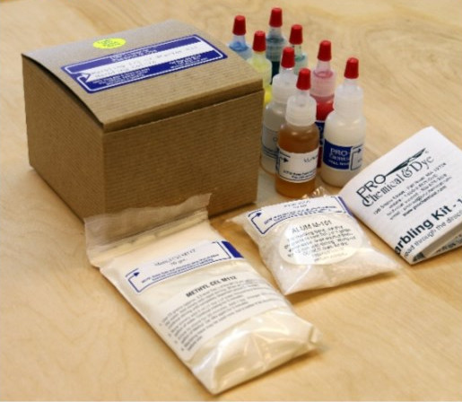 The materials I use come from Pro Chemical and Dye https://prochemicalanddye.net/). They have a marbling starter set for about eleven dollars that contains a sample set of 5 different paints and all the chemicals you need, the medium they provide is Methyl Cellulose. The sample set gives you enough methyl cellulose powder (7 Tablespoons (TBS) or 50 gm.) to make 2 gallons of solution. The starter kit also gives you clear ammonia that you add to dissolve the Methyl Cellulose (2 teaspoons) and enough alum (4 Tbls or 60 gm.) to make a half-gallon of solution.