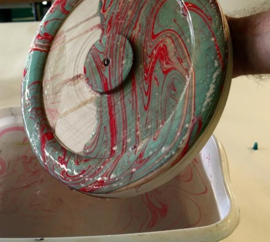 4. Distributing the paint on the medium and creating a design. Before adding paint the surface of the methyl cellulose should be skimmed with newsprint or paper towel to remove any bubbles, or material on the surface. There are many methods of putting the paint onto the methyl cellulose. Bulls eye, and random will be demonstrated. A toothpick or marbling comb can be used to create patterns in the paint. 5. Dipping the paper or wood into the medium. A handle of some sort must be fastened to the bottom of the platter in order to control the dipping process. Hot melt glue or double-sided tape can hold a handle onto the back of the platter.